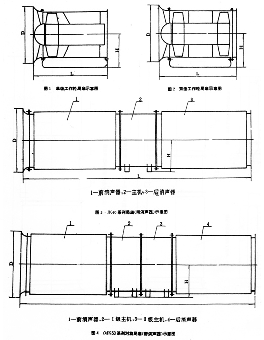 JK系列局扇的設計,綜合考慮了各類局部通風作業面所需的排塵排煙風量、風筒送風距離、常用風筒規格、風阻值,以及礦井內的使用條件等。JK系列局扇分為單級工作輪JK-1NO.(參見圖1)、雙級工作輪JK-2NO.(參見圖2)和對旋運轉DJK等三類。JK40系列局扇(帶前、后消聲器)的機構參見圖3,DJK系列對旋局扇(帶前、后消聲器)的結構參見圖4。其中JK40系列局扇和DJK50系列對旋局扇可以直接安裝在巷道底板上,也可以懸掛安裝在巷道的幫壁上或頂板下。